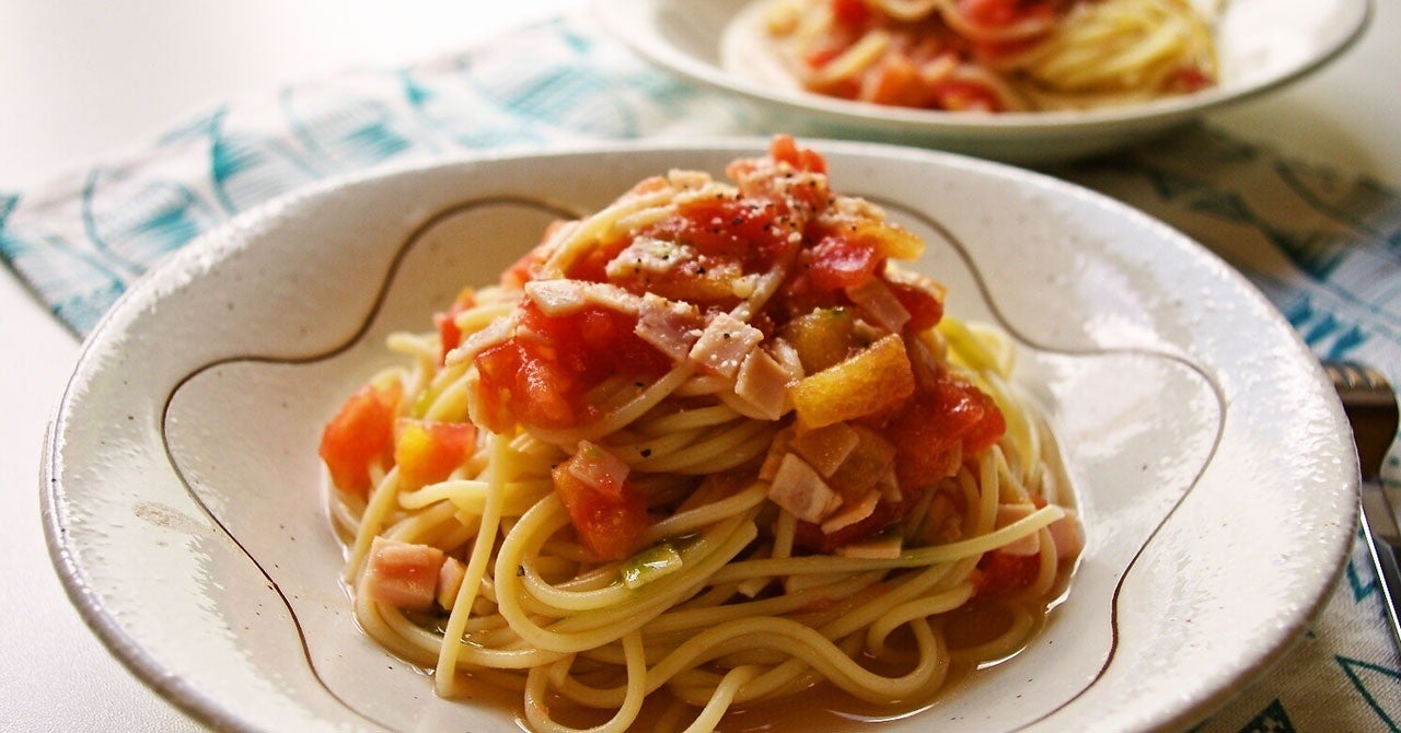フレッシュトマトをつぶして、刻んだハムと塩とオリーブオイルとニンニクなんかを入れて、冷蔵庫で休ませればソースのできあがり。パスタは普通の1.6ミリを11分ゆでました。細いパスタも好きですが、太いパスタを長めにゆでた、もっちりした食感の冷製パスタもおいしいです。